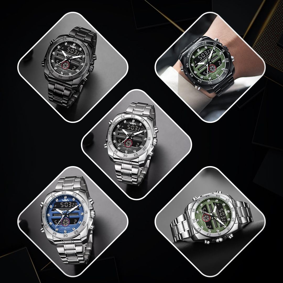The V2A Men’s Chronograph Watch is a perfect blend of bold aesthetics and advanced functionality. Designed for modern men who value precision and style, this watch features a large 42mm dial with an analogue-digital dual display, making it ideal for travellers and professionals who need to track multiple time zones. The LED backlight ensures easy readability in dark environments, while the luminous hands and marks always provide visibility in any low light. Built to last, the watch is encased in a durable zinc alloy case with a polished Silver finished, offering both resilience and elegance. The scratch-resistant Hardlex mineral glass ensures long-lasting clarity, The upgraded stainless steel strap not only adds a bold, sophisticated edge but also offers a secure, comfortable fit that transitions seamlessly from office to outdoors. Its polished metallic finish gives the watch a timeless appeal suited for any occasion. Designed for everyday use, the V2A wristwatch is 3-ATM water-resistant, making it resistant to minor water exposure like rain and handwashing. However, it is not suitable for swimming or diving. With additional features like a chronograph, stopwatch, alarm, and calendar, this watch is perfect for both active and professional lifestyles. Whether you’re in a business meeting, on an outdoor adventure, or simply going about your daily routine, the V2A Chronograph Watch is a stylish and reliable companion that complements any outfit. Plus, with a one-year warranty, you can be assured of its quality and durability.