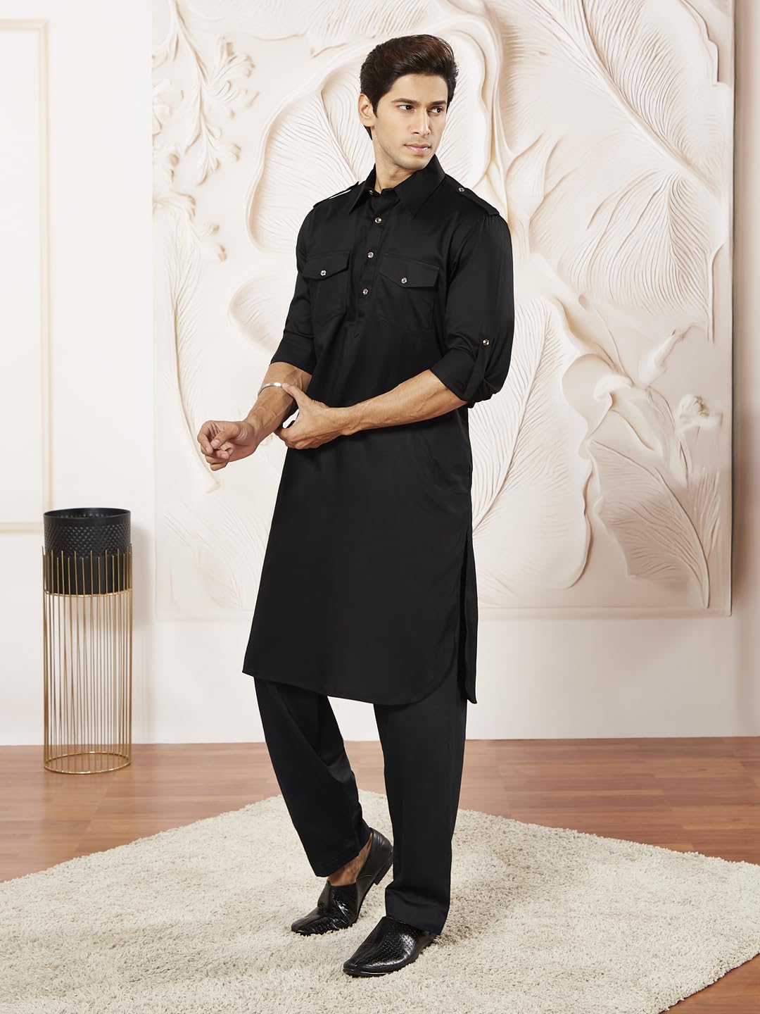 VASTRAMAY Men’s Cotton Blend Pathani Kurta Set || Shoulder Flaps, Two Pockets with Flap, Cuff Plus Rollover Sleeves and Relaxed Fit Salwar Patiala Pyjama. || Elegance for Holi & Eid Celebration