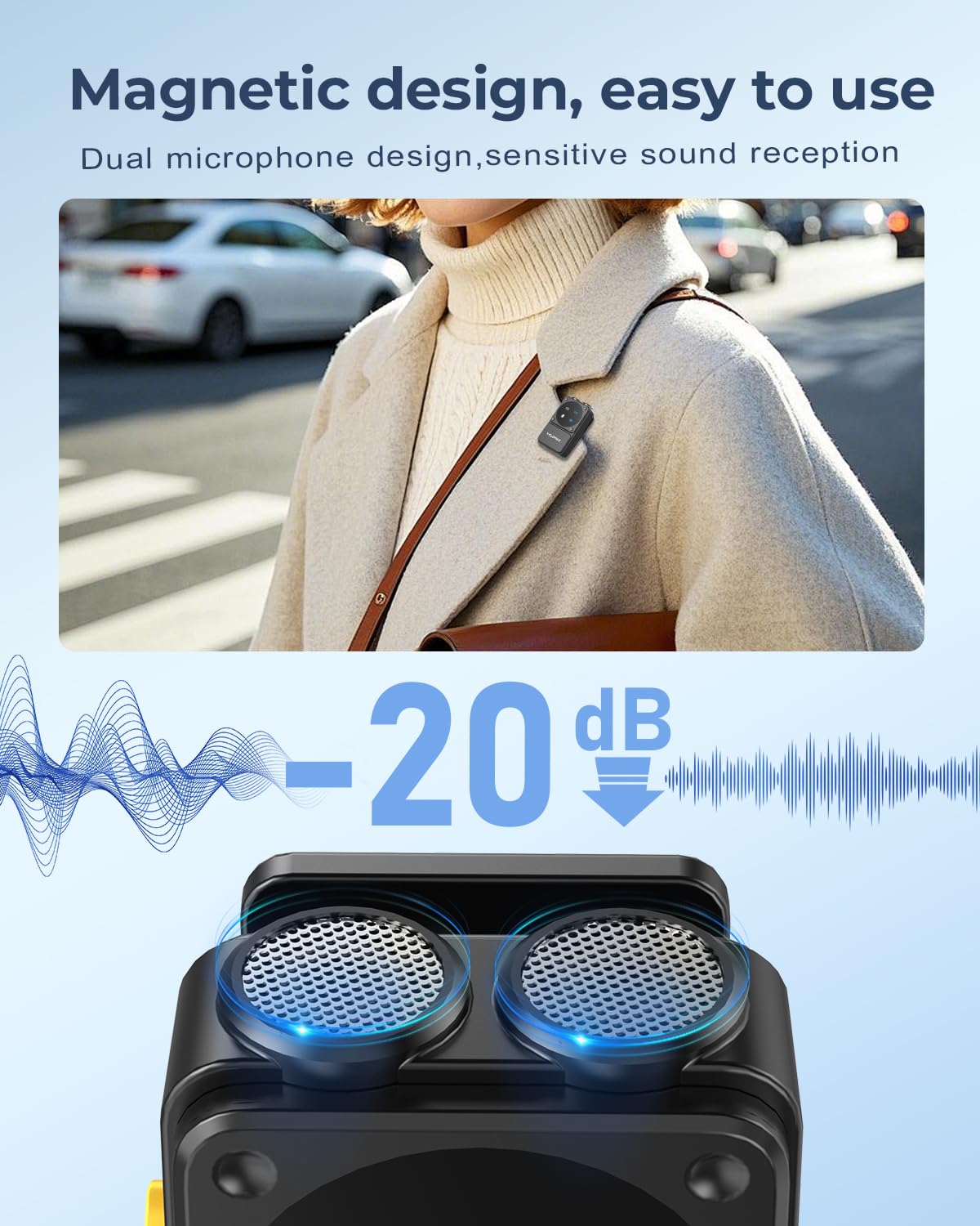 đŸŽ€ă€Simple & Intuitive Controls for Professional Audio】Control volume with three adjustable levels, mute instantly, and customize your sound with noise cancellation and reverb settings. Whether you need a bluetooth mic for vlogging or a wireless mic for YouTube interviews, this mic wireless offers versatile features to elevate your audio quality.