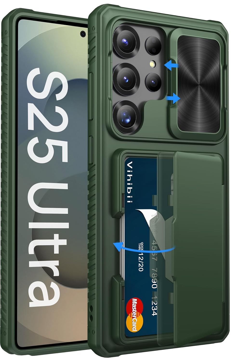 Vihibii for Samsung Galaxy S25 Ultra Case with Card Holder (4 Cards), RFID Blocking & Slide Camera Cover, Military Grade Drop Protection, Rugged Hard Back & Silicone Edge Wallet Case, 6.9″ 2025, Green