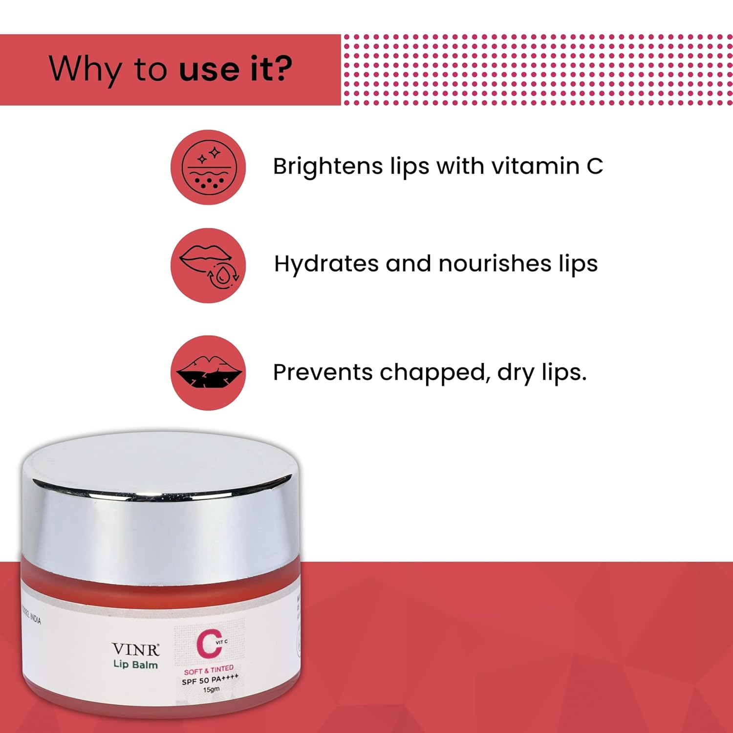 DUAL PROTECTION AT ITS FINEST The VINR Lip Balm is more than just a beauty product—it’s a powerhouse of dual-action care, combining deep skin nourishment with advanced sun defense to keep your lips healthy, radiant, and protected all day long.Together, Vitamin C and SPF 50 PA++++ create a powerful synergy: one nourishes, repairs, and revitalizes, while the other defends, preserves, and protects. It’s the perfect balance of skincare and sun care in one effortless swipe.