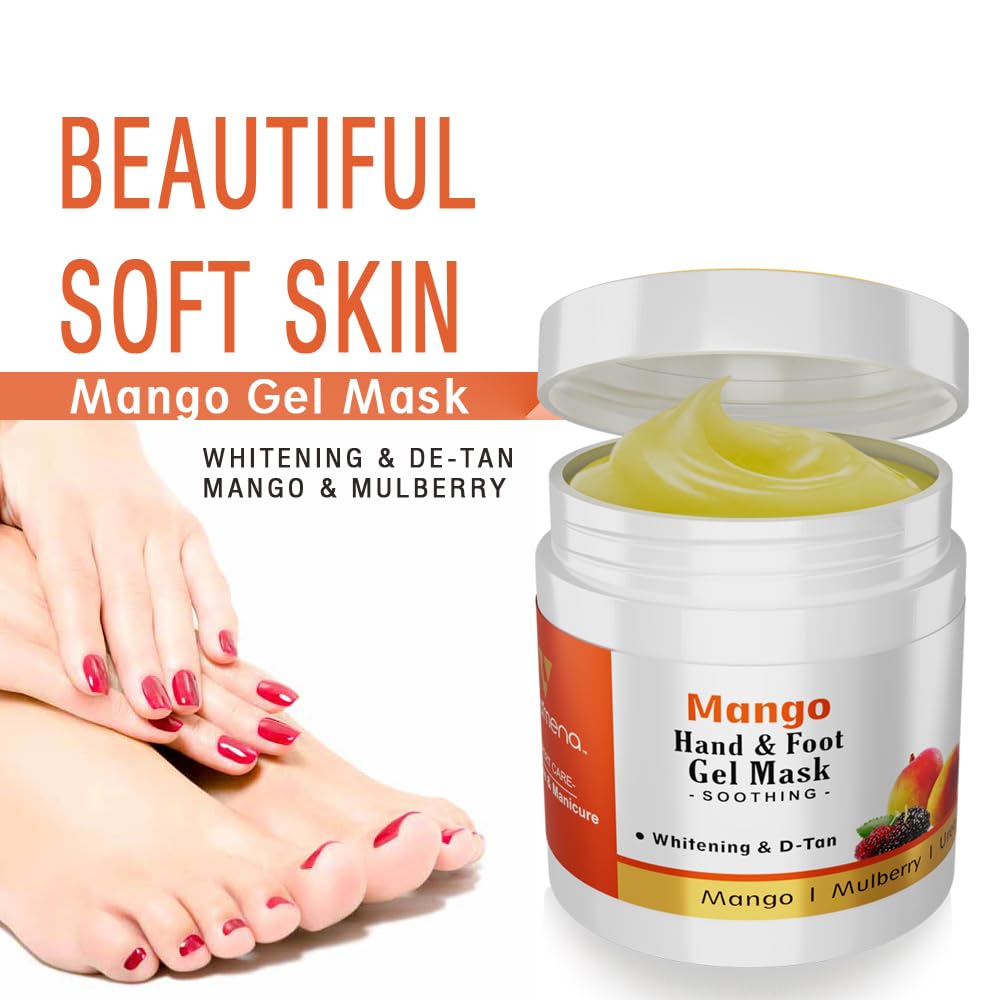 Volamena Mango Hand and Foot Gel Mask – 100ml – Nourishing & Hydrating Treatment for Soft, Smooth Hands & Feet Revitalize your hands and feet with Volamena Mango Hand and Foot Gel Mask, a luxurious, deep-nourishing treatment designed to restore softness and hydration. Enriched with the goodness of mango extract, this mask deeply penetrates the skin, leaving your hands and feet feeling smooth, refreshed, and rejuvenated. Whether your hands and feet are dry, cracked, or tired from daily wear and tear, this gel mask helps to soothe, hydrate, and repair skin, providing an instant boost of moisture. The mango extract is packed with vitamins, antioxidants, and essential fatty acids that nourish and protect the skin, helping to lock in moisture and improve skin elasticity. It also has soothing and anti-inflammatory properties, which make it perfect for calming rough, calloused skin and reducing any irritation. The formula also includes ingredients that promote smooth, soft skin, helping to reduce the appearance of rough patches and dryness. This gel mask is designed for easy use. Simply apply a generous amount to your hands and feet, and let the nourishing ingredients work their magic. The gel will quickly absorb into the skin, providing a burst of hydration without leaving behind any greasy residue. For maximum benefits, use it regularly to keep your hands and feet feeling pampered and soft. Volamena Mango Hand and Foot Gel Mask is perfect for anyone seeking a relaxing, hydrating treatment for their hands and feet. Whether you’re dealing with the effects of harsh weather, frequent washing, or simply want to indulge in a little self-care, this gel mask offers a convenient and effective solution. Suitable for all skin types, it’s gentle enough for sensitive skin while providing deep hydration and nourishment. This 100ml bottle is the ideal size for home use and travel, allowing you to enjoy the benefits of a spa-like treatment whenever you need it. Treat yourself to the indulgent, moisturizing benefits of mango extract and reveal softer, more youthful-looking hands and feet. Whether used as part of your weekly skincare routine or for an occasional pick-me-up, Volamena Mango Hand and Foot Gel Mask is the ultimate skincare solution for your hands and feet. Experience the soothing power of mango for soft, hydrated hands and feet – perfect for all skin