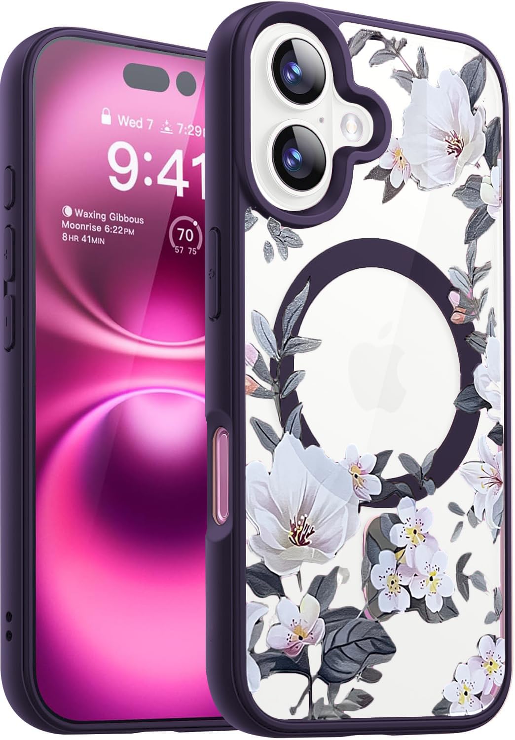 VONZEE Compatible with iPhone 16 Plus Case Luxury Retro Flowers Floral Clear For Magnetic Wireless Charging Case Shockproof Case PC+TPU Cute Glossy Shiny Cover For Girls Women, 6.7” Deep Purple