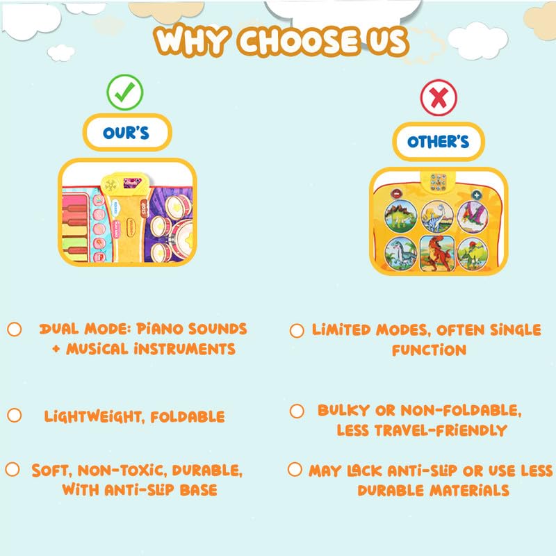 DURABLE SAFE & CHILD FRIENDLY: Crafted with kids in mind, this playmat is made from soft, non-toxic materials, ensuring a safe play experience. The durable design withstands active use, while the anti-slip base keeps the mat stable during play. The touch-sensitive keys and drum pads respond accurately to touch, making the experience immersive and enjoyable for little musicians.