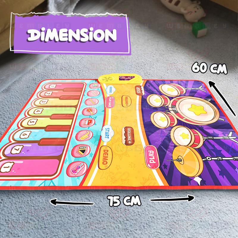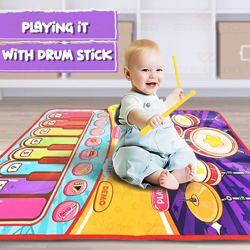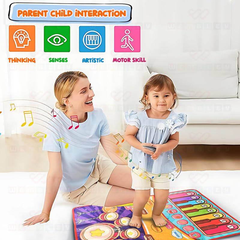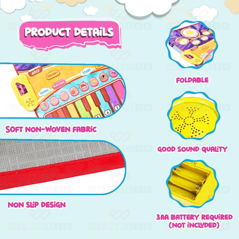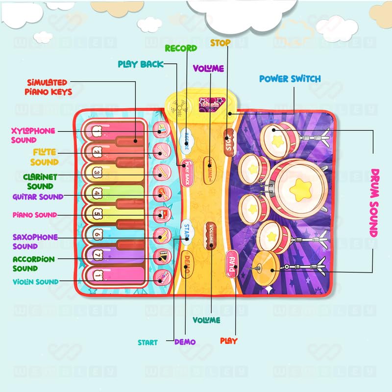 INTERACTIVE 2-IN-1 MUSIC PLAYMAT: Introduce your child to the joy of music and rhythm with the Wembley 2-in-1 Music Playmat. This engaging playmat combines a simulated piano keyboard and a full drum set, offering kids a chance to explore two musical instruments in one toy. Designed for boys and girls aged 3 and above, it promotes fun-filled, active play while fostering creativity and musical development.