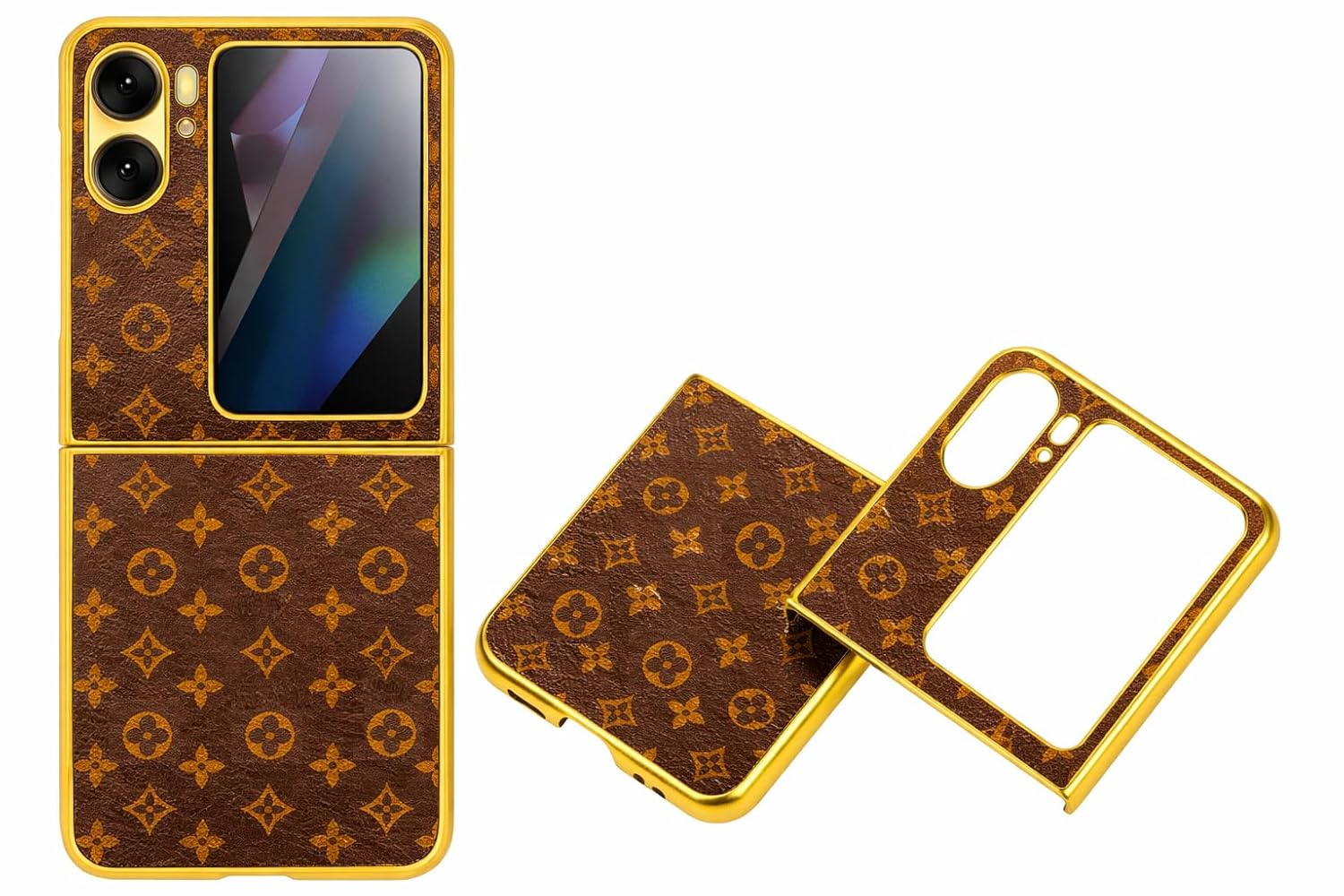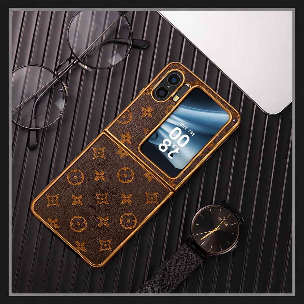 WHITBULL PU Monogram Style Leather Pattern Gold Electroplated Borders Back Case Cover Shockproof Lightweight Protective Cover Compatible with Oppo Find N2 Flip 5G (Brown)