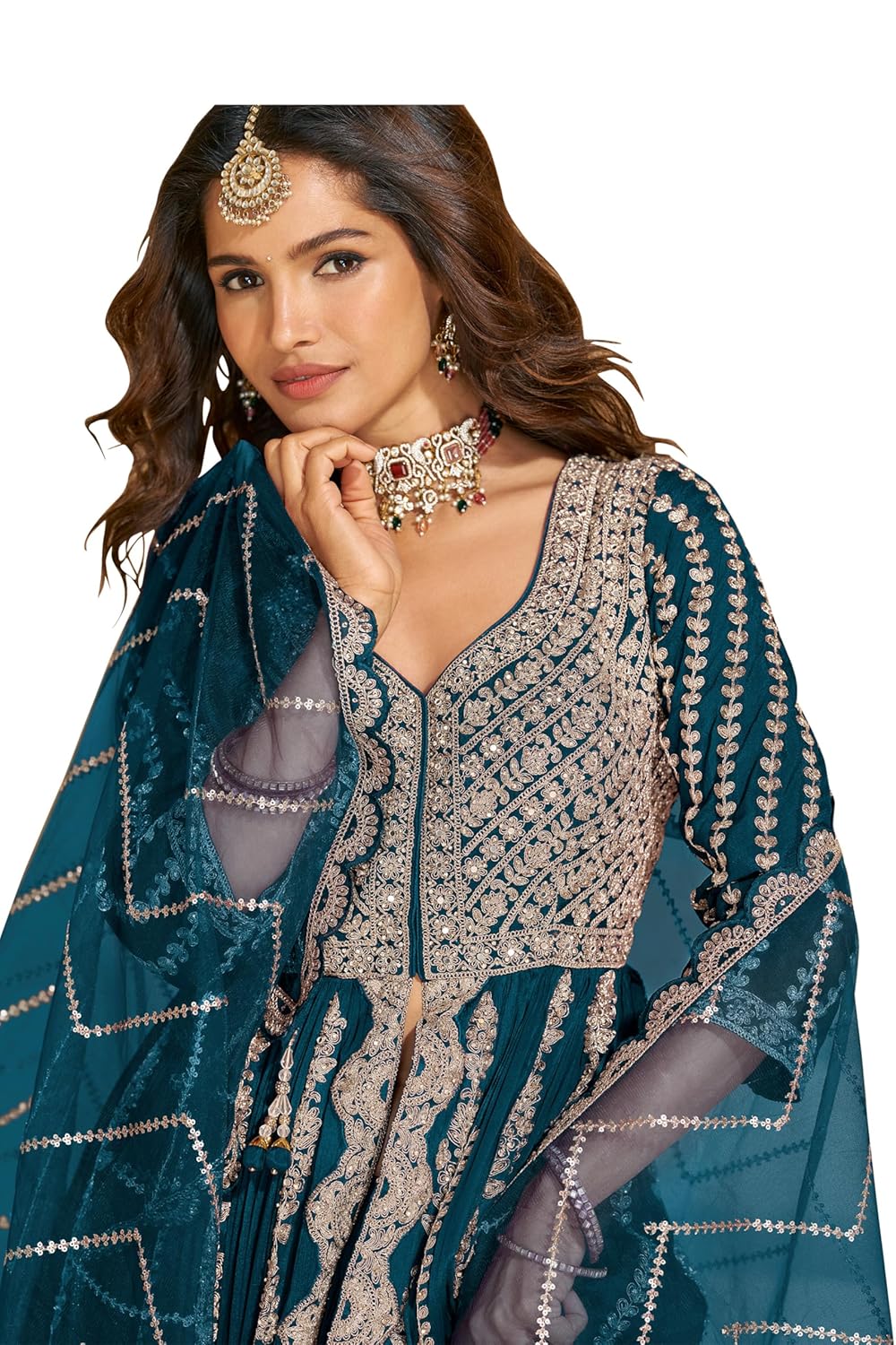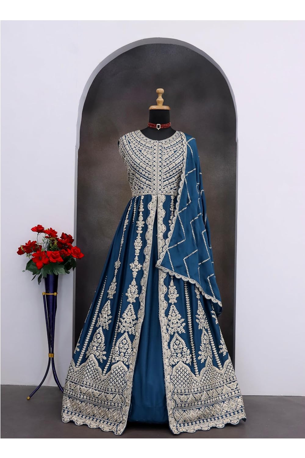 WOMEN’S Chiffon Unstitched Pakistani Wedding Suit – Luxury 3-Piece Gown with Heavy Embroidery and Dupatta (SF271392 Light Blue free-size)