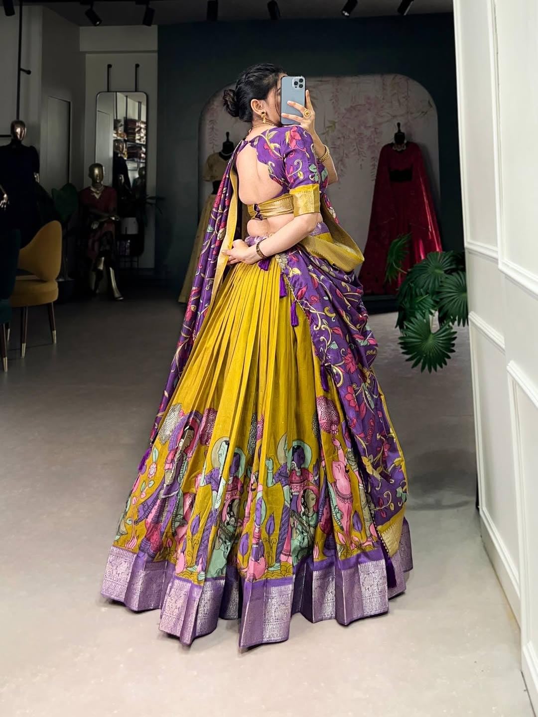 Lehenga Fabric : Tussar Silk, Blouse fabric : Tussar Silk, Dupatta Fabric : Tussar Silk Lehenga Work : Tussar Silk choli and dupatta with Floral print with zari weaving border, Blouse Work : Floral print zari weaving border, Dupatta Work : Floral print with zari weaving border Also Comes With Tassels Lehenga Lenth:42 Inch ,Blouse Length : 1 Meter, Dupatta Length : 2.5 Meter Lehenga Waist : SUPPORTED UP TO 42 INCH, Lehenga Closer : Drawstring With Heavy Tassels and Zip ,Stitching : Semi Stitched With Canvas and attached with Can Can ,Flair : 3.40 Meter ,Inner : Micro Cotton Package Contain : Full Stitched Lehenga, Unstitched Blouse, Dupatta with Tassels And Latkans.