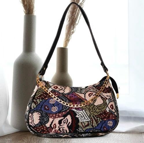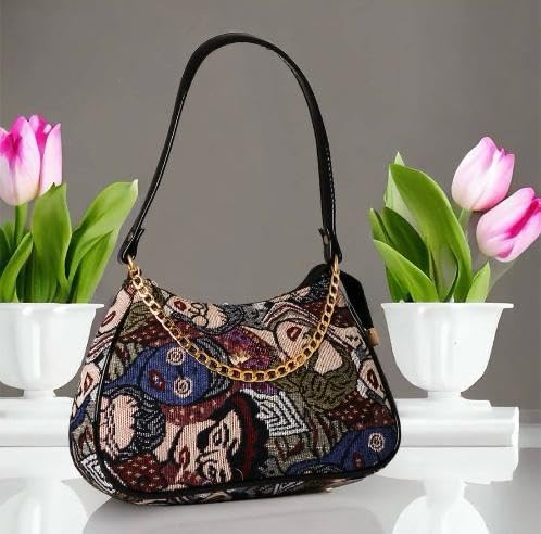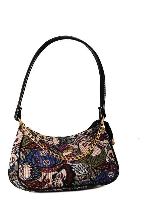 Add a touch of vintage elegance to your ensemble with this exquisite tapestry shoulder bag. The striking multi-colour floral pattern showcases intricate artistry with rich blues, earthy tones, and delicate botanical motifs woven into a sophisticated tapestry fabric. The sleek black handle provides comfortable carrying, while the luxurious gold-tone chain detail adds a contemporary accent to the classic silhouette. This versatile bag features a curved, compact design that’s perfect for both casual outings and special occasions. The durable construction and timeless appeal make it an ideal accessory for the fashion-conscious individual who appreciates artistic details and practical functionality. The bag’s size strikes the perfect balance between spaciousness and elegance, allowing you to carry your essentials while maintaining a refined look. The textured tapestry material creates a unique tactile experience and ensures this distinctive accessory stands out in any collection.