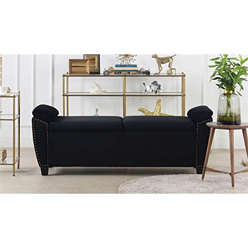 Wood Maker : This Taylor Velvet Storage Bench is a versatile piece that blends with a range of styles and locations in any home. Use it to store accessories in the entryway or mudroom, to hide controllers or remotes in the family room or to stash extra blankets and pillows in the bedroom. It can serve as an ottoman, a coffee table, the end of a bed bench or as a hallway or entryway bench. This eye-catching storage bench has a hinged lid that provides easy access to storage inside, and a solid wood frame and wood legs in a dark black matte finish.