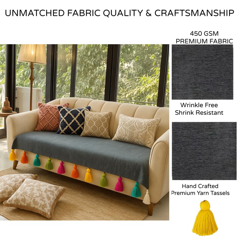 AESTHETIC SOFA RUNNER: Focal Point Creation: The Dark Grey Sofa Cover with contrasting tassels instantly draws the eye making your sofa the centerpiece of your living room or lounge.The Sofa Cover with tassels is more than just a protective layer for your sofa. Interior designers recommend this versatile throw for its ability to layer effortlessly with bold cushions textuDark Grey rugs and accent furniture.
