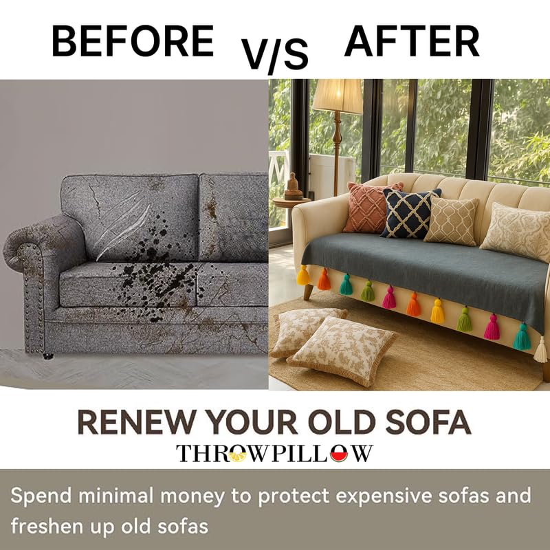 ANTI SLIP SOFA COVER: Wrinkle-Free and Shrink Resistant The wrinkle-free fabric ensures a polished look while the shrink-resistant material maintains its shape and size after multiple washes.Throwpillow Sofa Cover doubles as a sofa throw cover, sofa cover with gonda, tassels sofa cover, or sofa cover mat. It’s a tassels antislip sofa cover, sofa seat cover with tassels, bohemian sofa covers with tassels, sofa cover with pompom, or sofa sheet coverr, slipcovers for sofa—a stylish, festive pick.