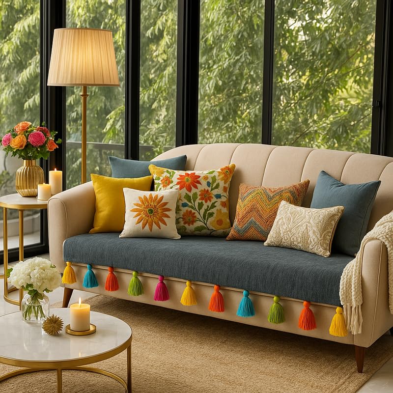 BOHO LIVING ROOM DECOR: Whether you’re refreshing your living room for Diwali or looking to revamp an old sofa this cover brings a designer and stylish touch to any space.Its festive colors and tassel details make it a great fit for seasonal updates. This colourful sofa cover is not just a decorative sofa throw with Dark Grey tassels; it’s perfect for Diwali and other celebrations adding a touch to your home. Make every gathering special with our desginer sofa cover.