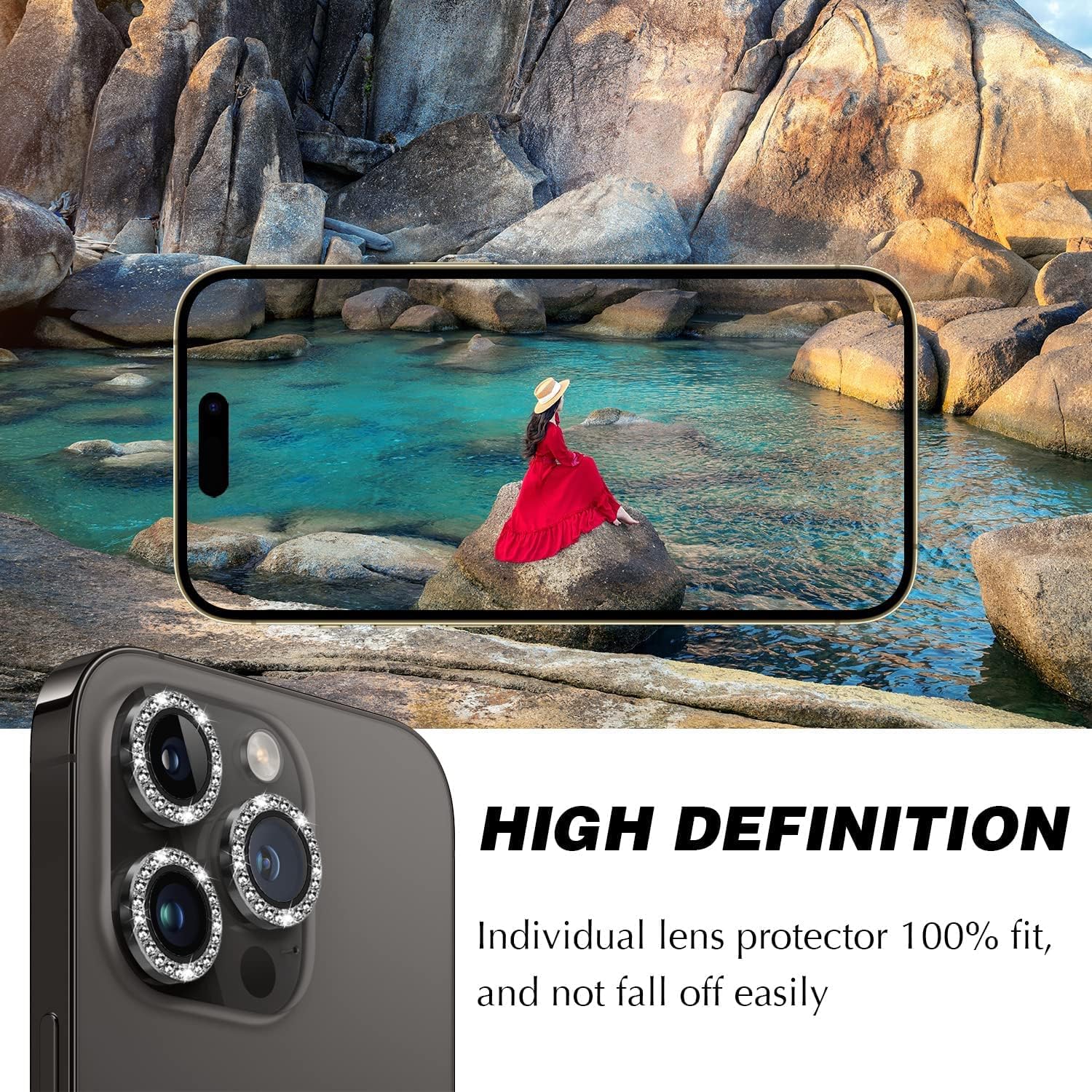 [Anti-Drop, Anti-Scratch and Anti-Vibration Protection] The aviation Tempered Glass metal ring and 9H tempered glass diamond camera protector resist your iPhone from huge impacts and drops from external forces. The seal ring is designed to provide water, oil, and dust protection for your phone’s lens.